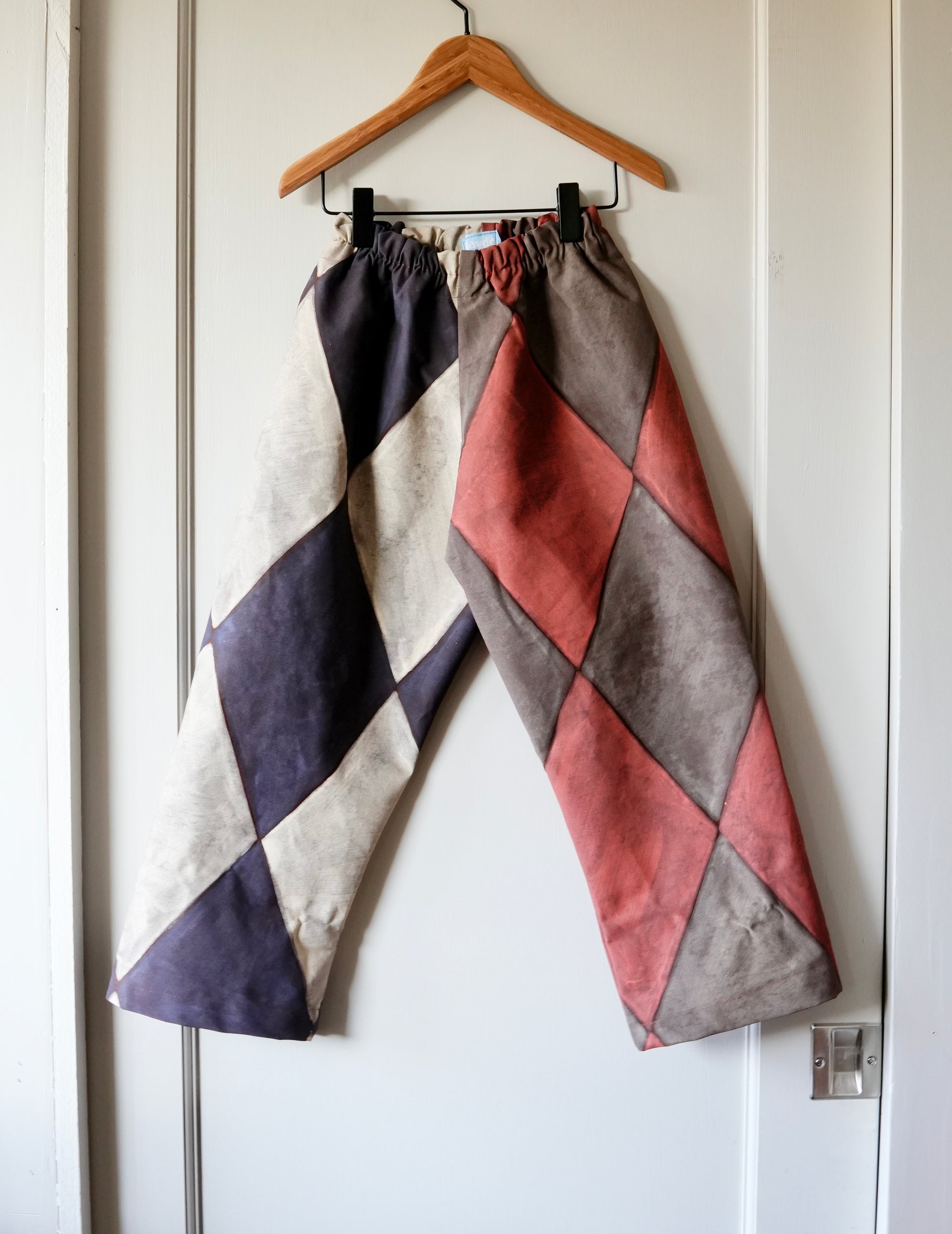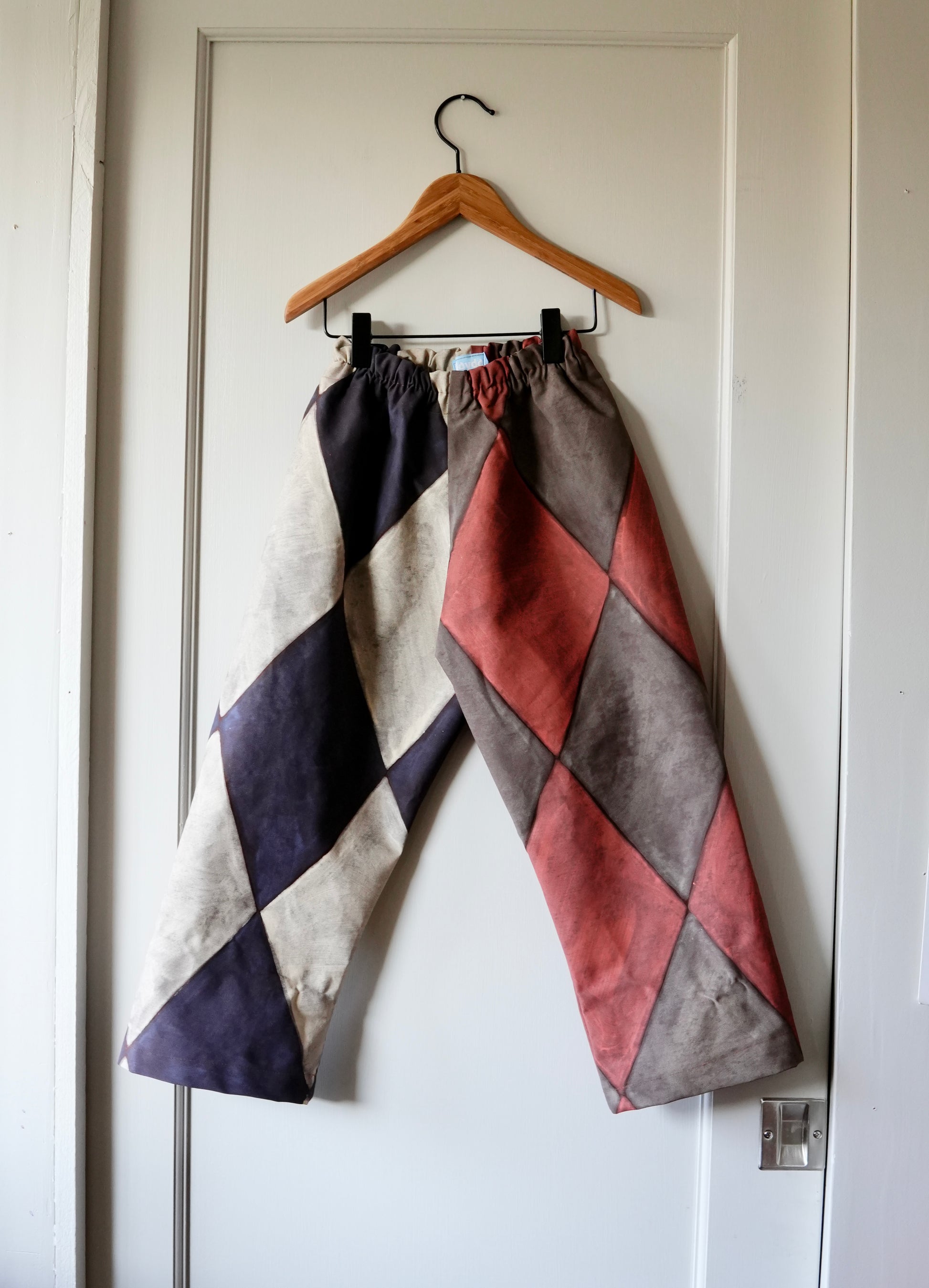 Hand painted diamond jester pants made with reclaimed cotton fabric.