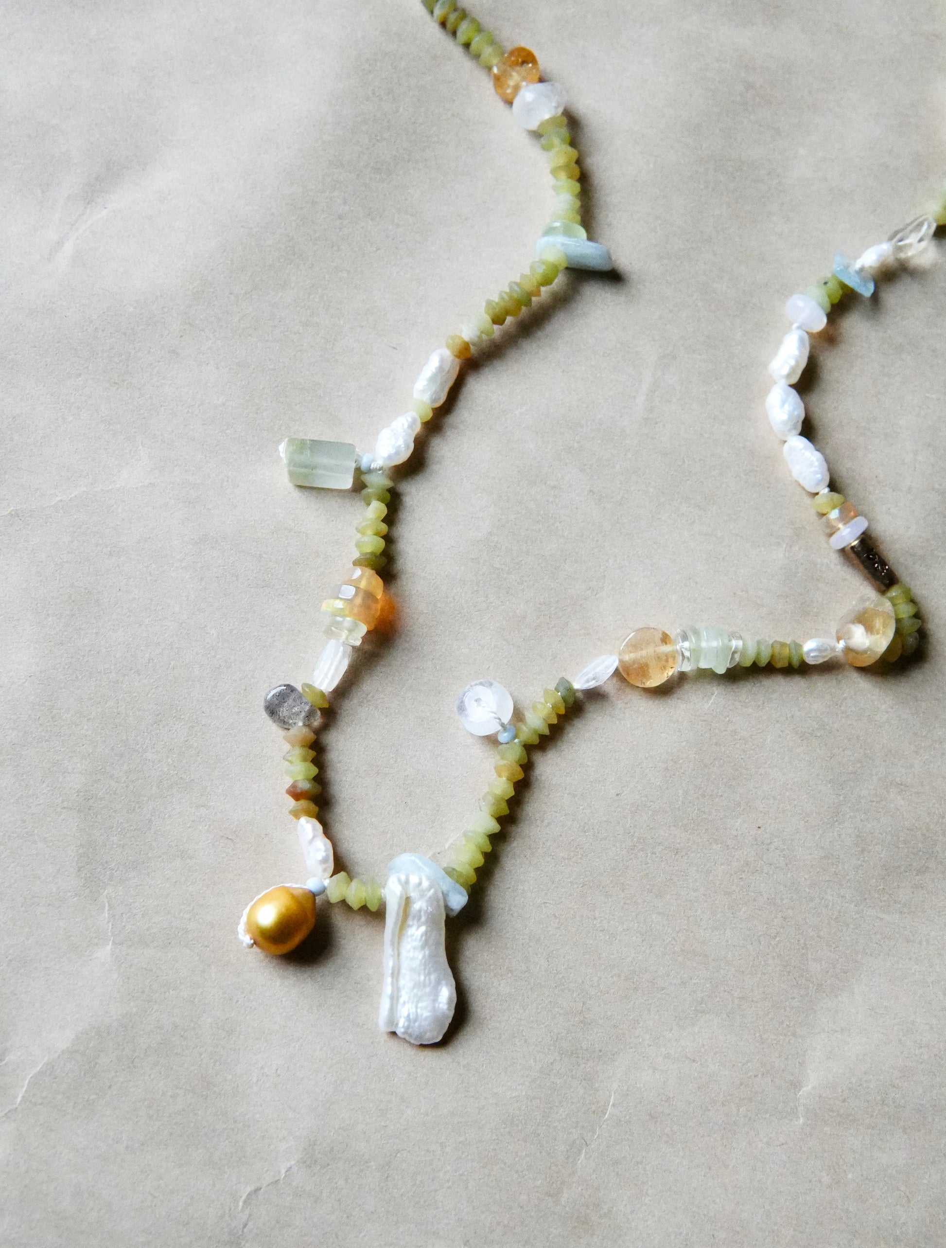 Serpentine saucer stone beads sit alongside citrine, opals, and pearl from repurposed, reclaimed, and new sources. No two are the same. Delicately hand-knotted silk gives place for forgotten treasures to exist in balance with each other.