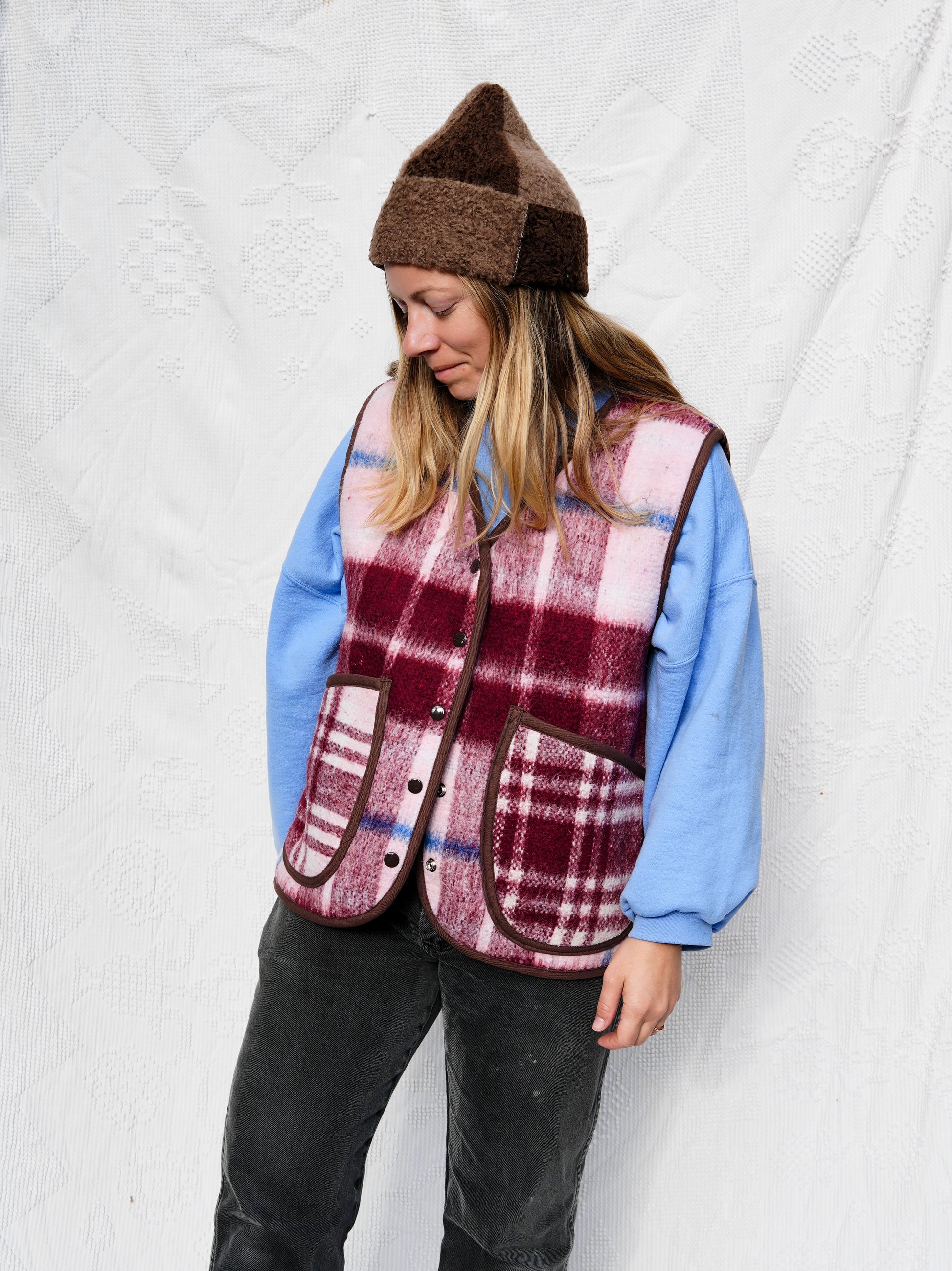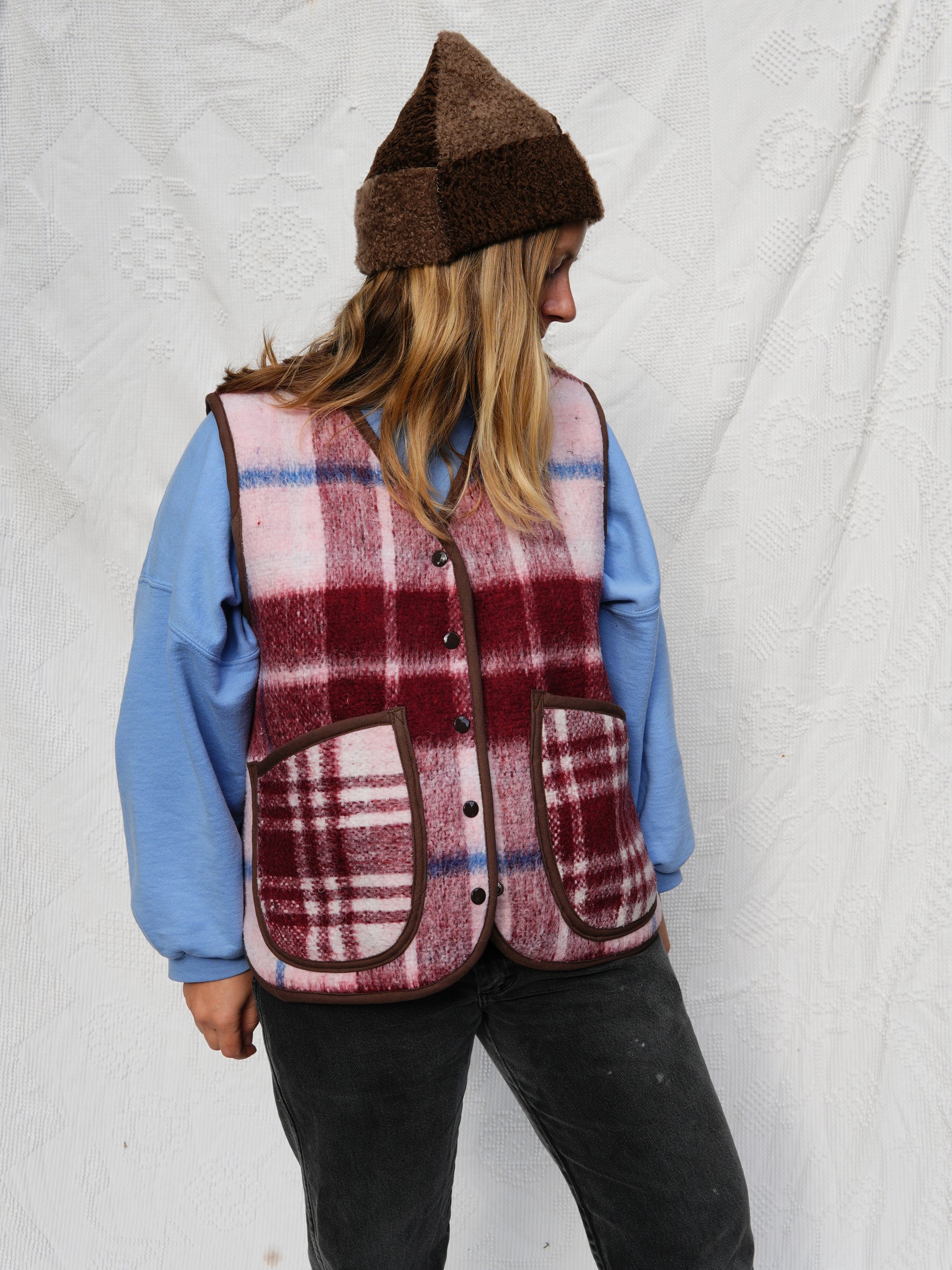 Made from a repurposed plaid blanket with two front patch pockets and snap front closure. Quilt is medium weight and in excellent condition. Bound in a contrasting blue fabric.
