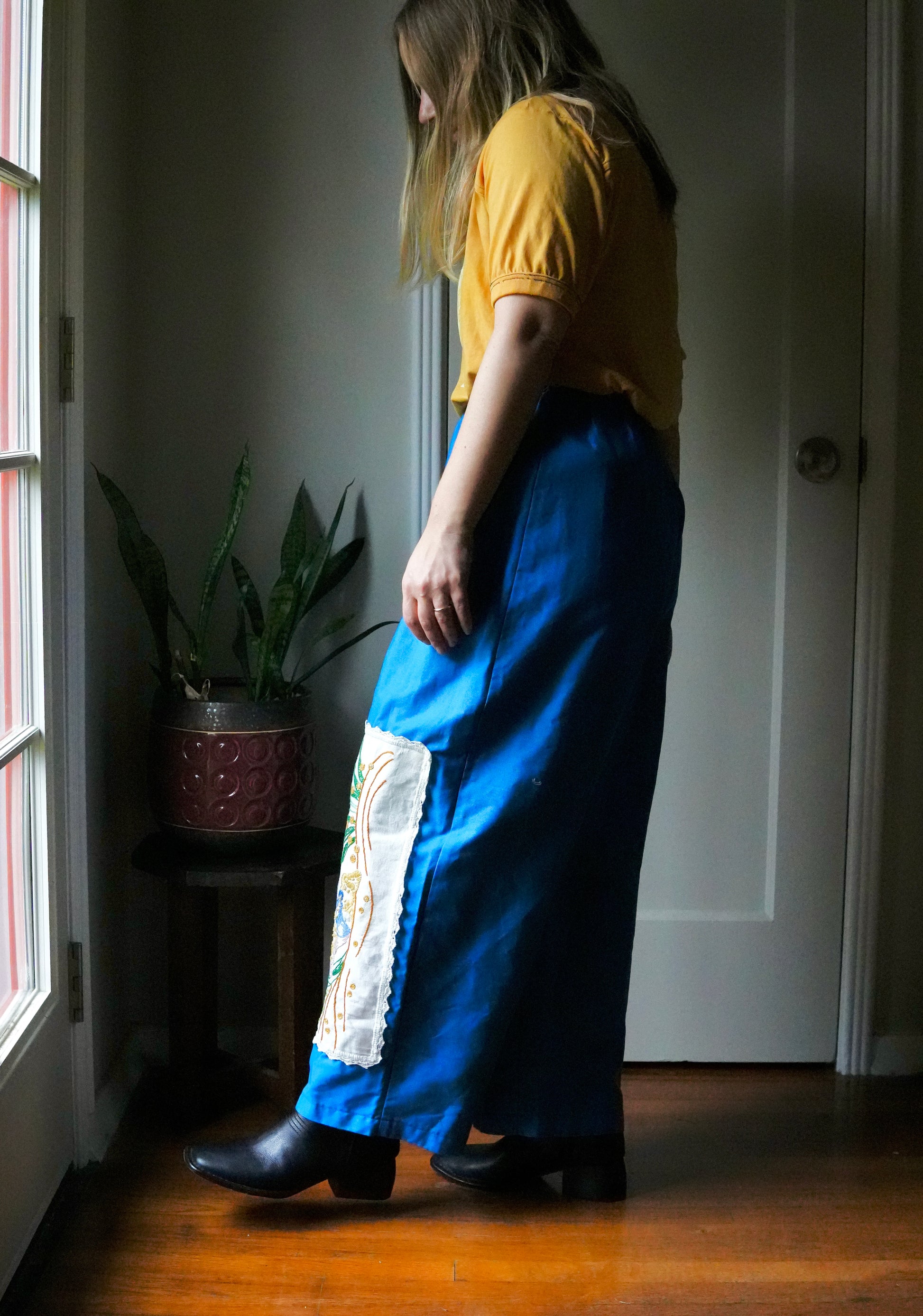 Made from a structured cotton fabric with an elastic waist band with a slight barrel shape to the roomy leg. Amazing chanterelle embroidered linens on the knees.