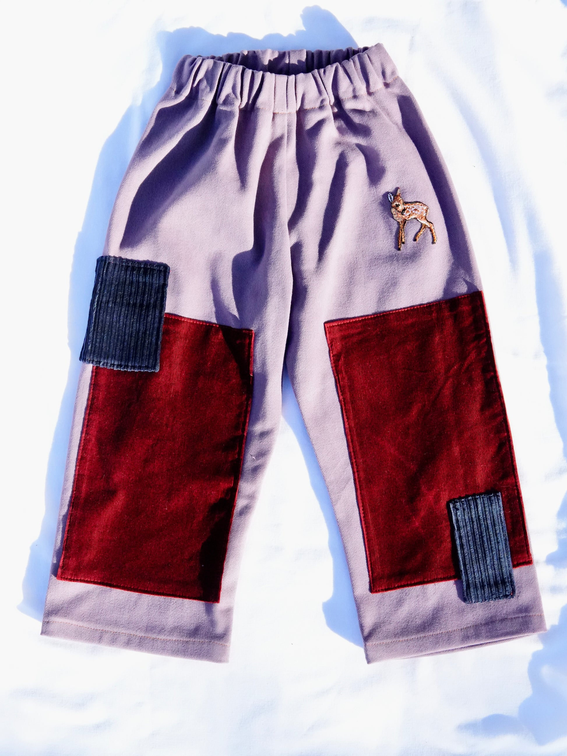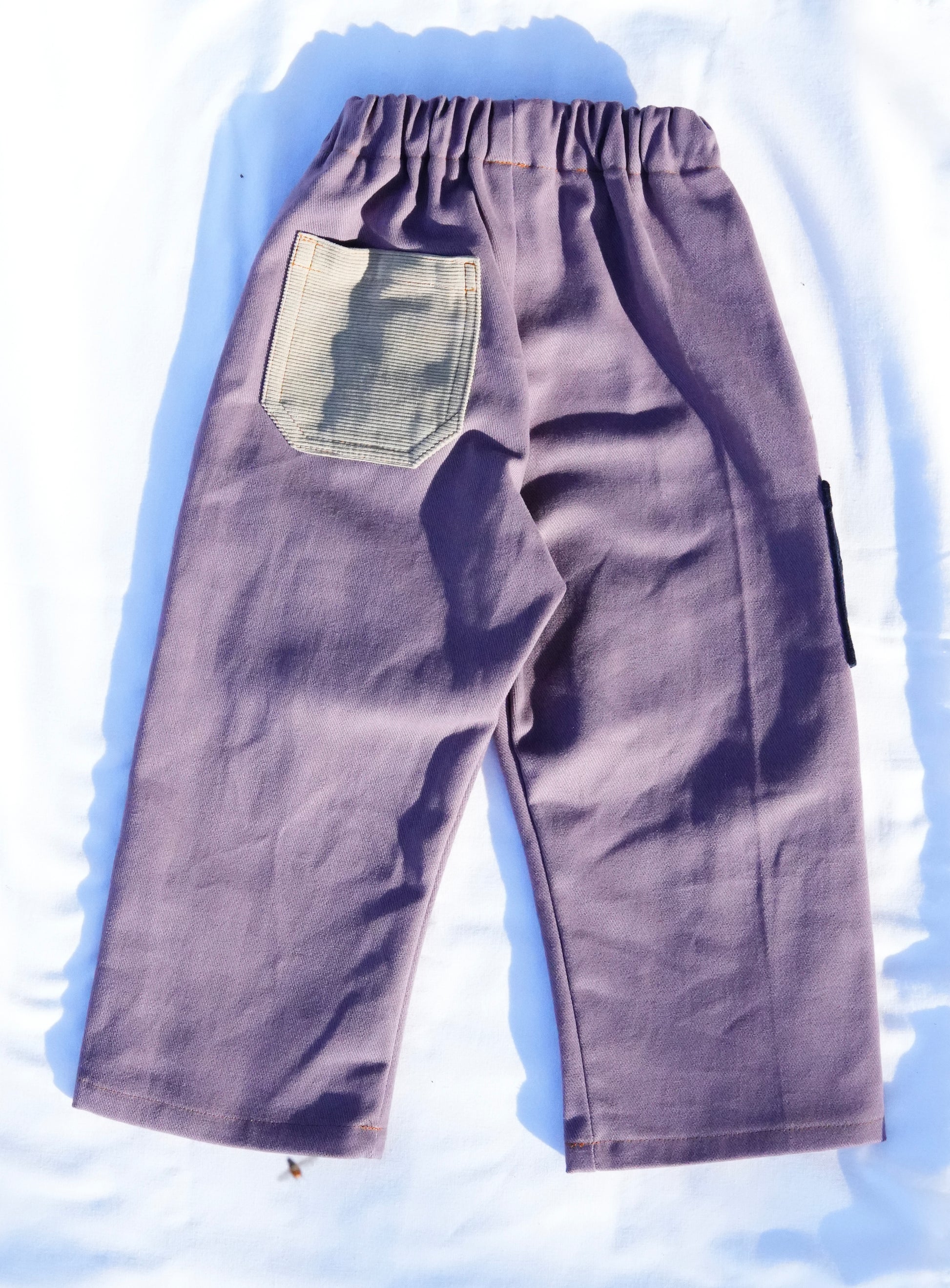 Patchy corduroy pants with a cutie vintage patch. Made with reclaimed and vintage fabric, this pair is made from a gorgeous lilac twill.