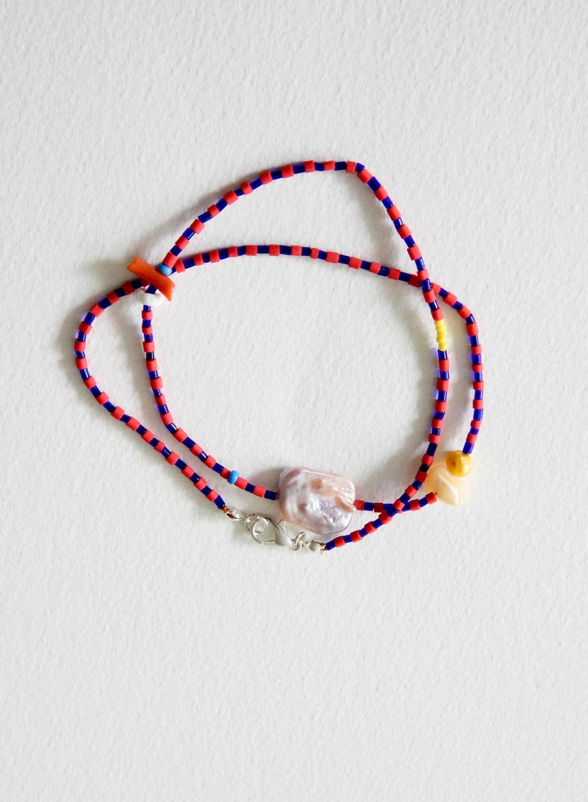 Pattern Play is a collection filled with minimally patterned strands interrupted periodically by the joyfully unexpected. A play on simplicity and balance that celebrates a minimal approach to a colorful everyday design. Antique seed beads sit along side pearls, shells, handmade glass beads. Each is one of a kind.
