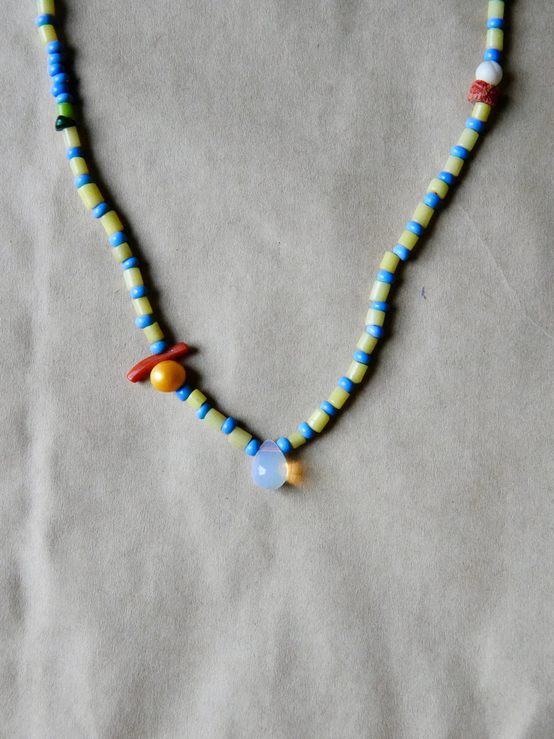 Pattern Play is a collection filled with minimally patterned strands interrupted periodically by the joyfully unexpected. A play on simplicity and balance that celebrates a minimal approach to a colorful everyday design. Antique seed beads sit along side pearls, shells, handmade glass beads. Each is one of a kind.