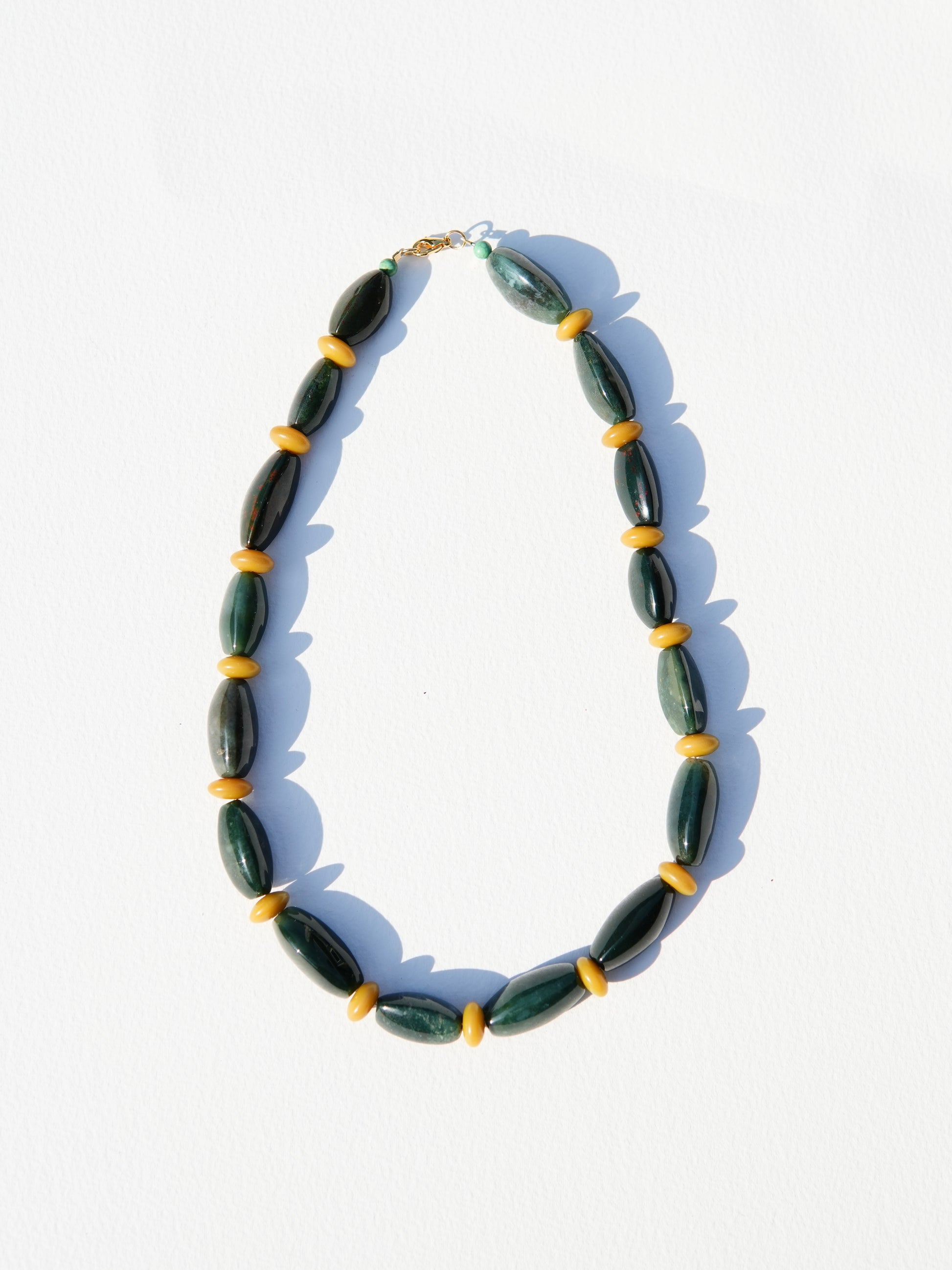 A necklace patterned with contrasting forest green vintage agate stones and ochre acetate beads. OOAK