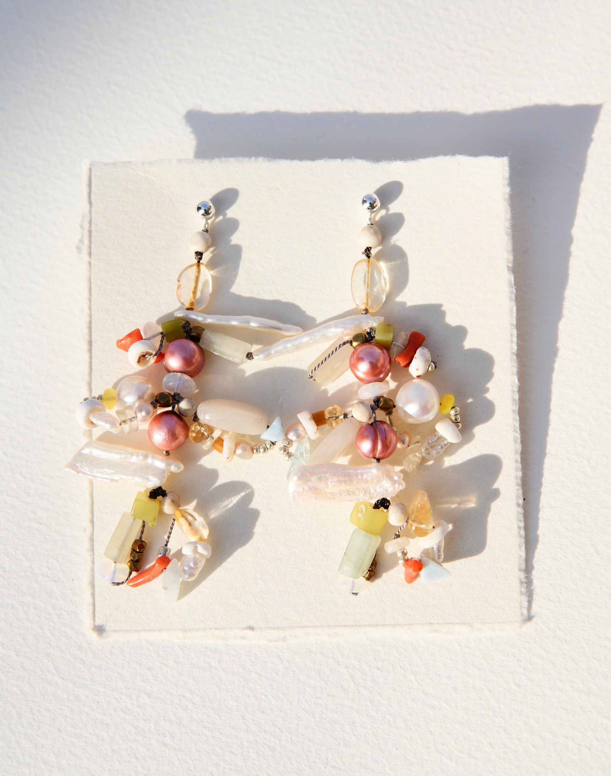 Pearly sculpture drops made with a gorgeous array pearls and semi precious stones. Materials come from a mix of secondhand, vintage, repurposed, and new sources.