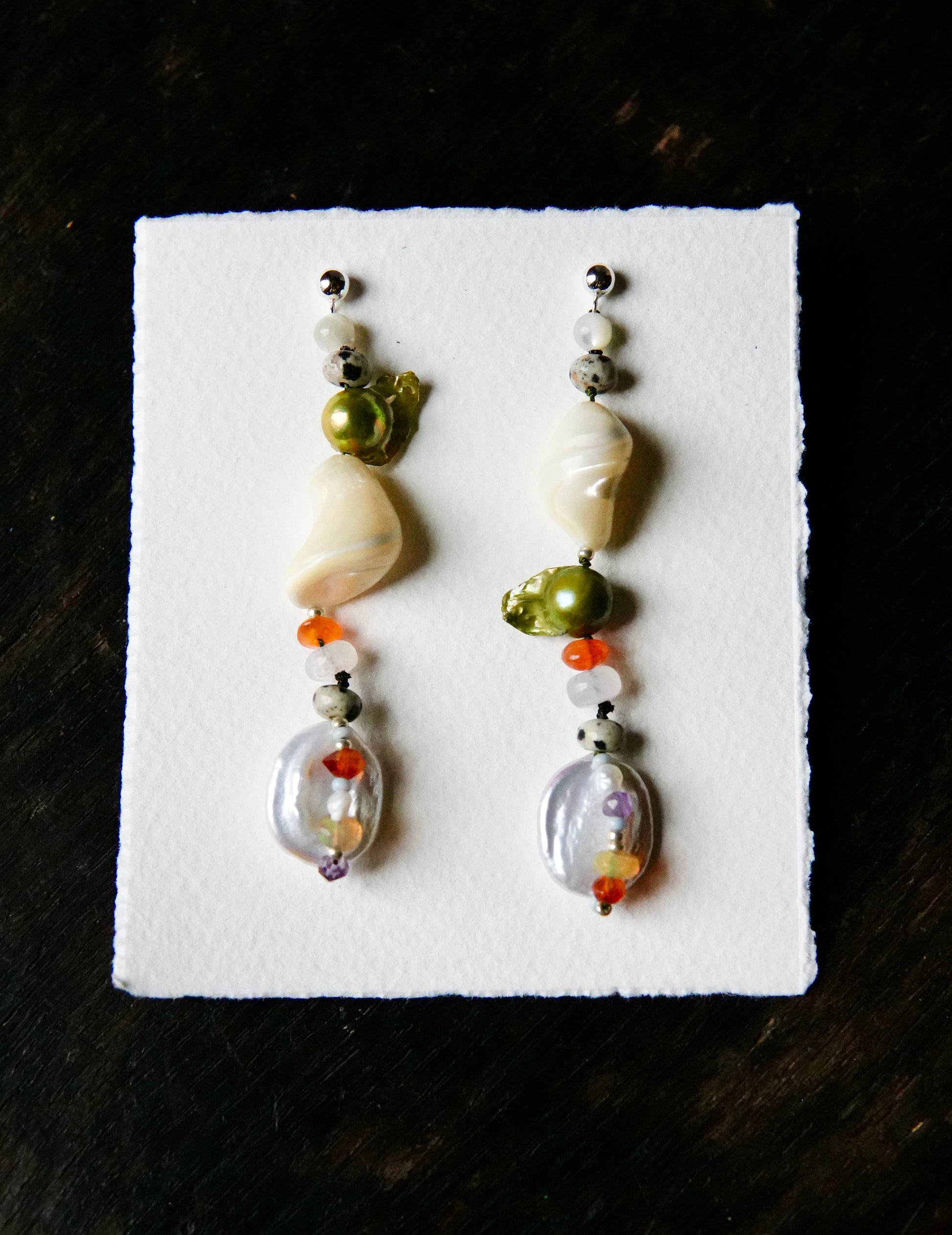 Pearly sculpture drops made with a gorgeous array pearls and semi precious stones. Materials come from a mix of secondhand, vintage, repurposed, and new sources.
