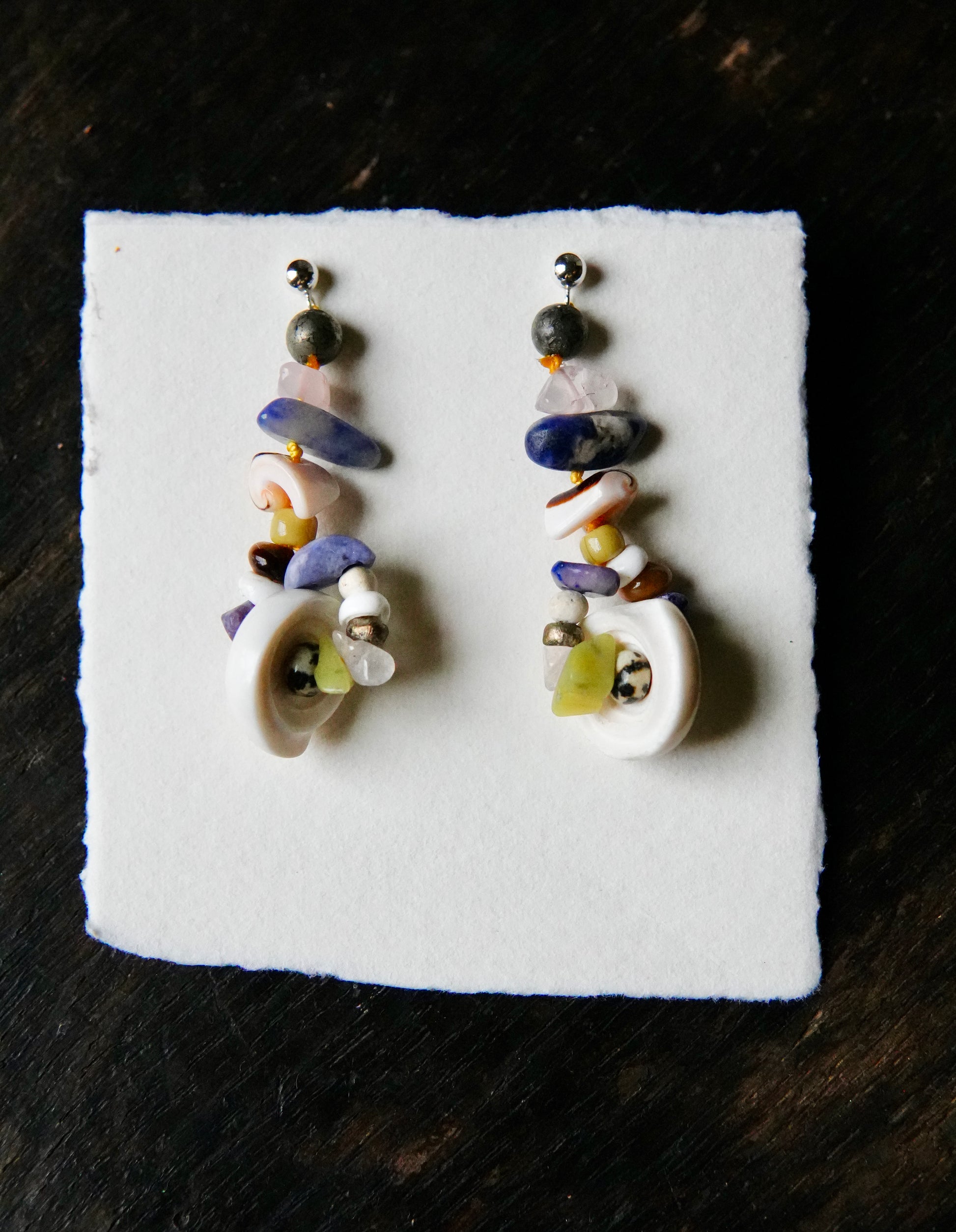 Pearly sculpture drops made with a gorgeous array pearls and semi precious stones. Materials come from a mix of secondhand, vintage, repurposed, and new sources.