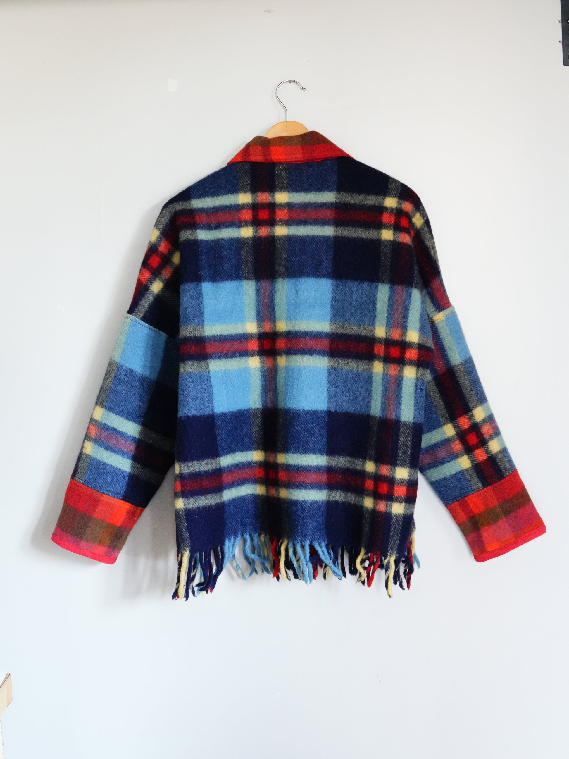 One of a kind coat made form a two plaid wool blankets. Features a snap front closure and two front patch pockets with a dropped sleeve, slightly longer length with fringe:)