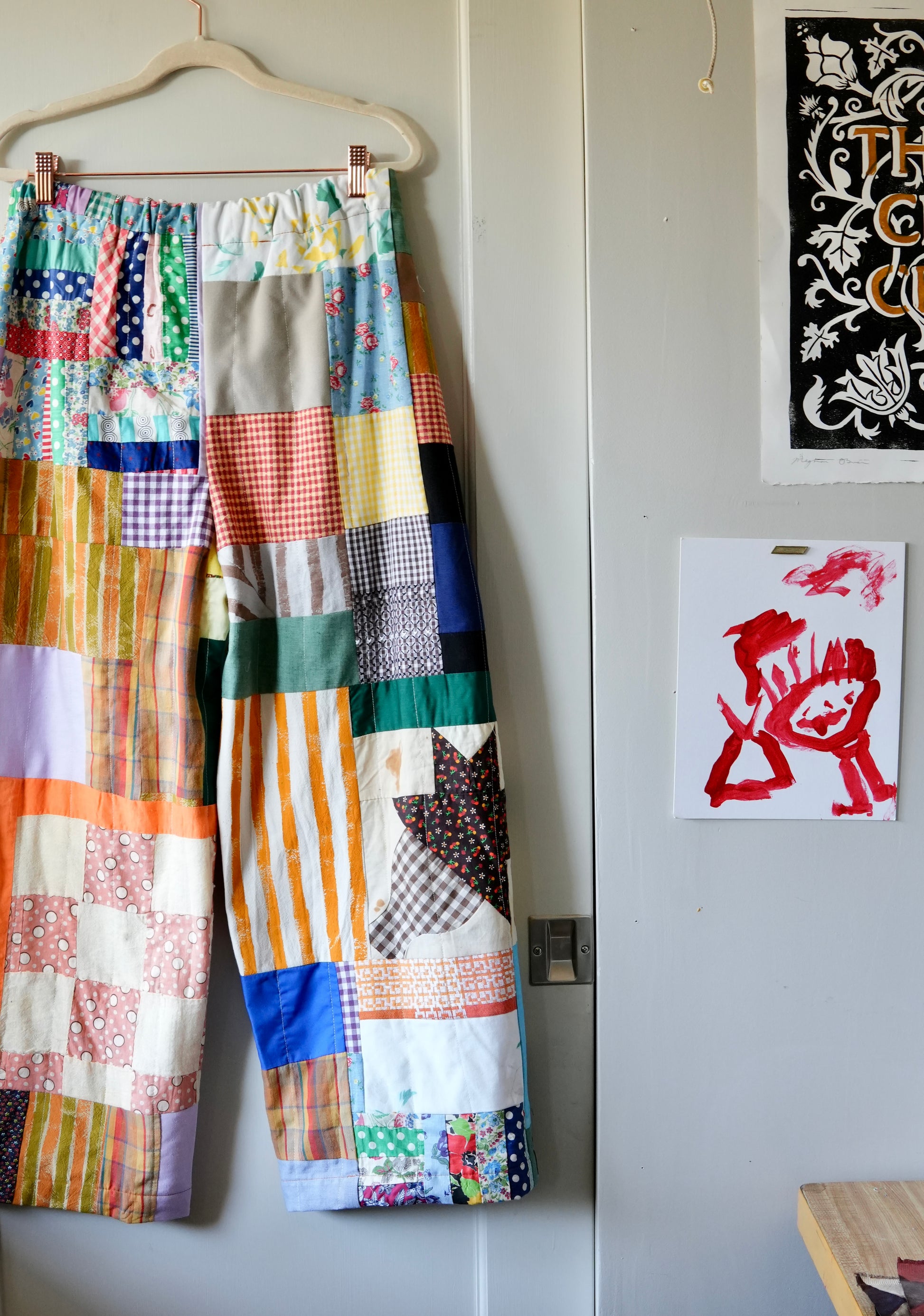 Made from vintage quilt tops and fabric remnants, each pair of quilt pants are hand quilted and attached to a bed sheet fabric lining. Elastic waist band with a slight barrel shape to the roomy leg.