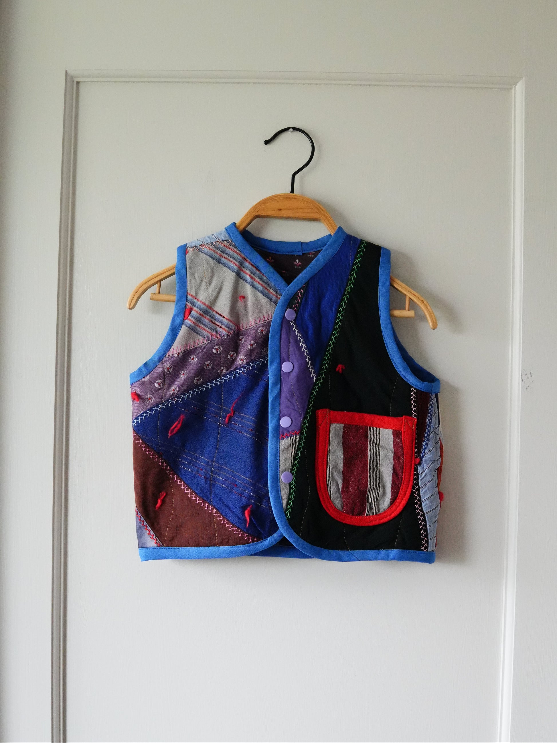 Colorful kiddos quilt vests made from a small handmade log cabin quilt. Small goose patch on reversible side with a micro floral sage green background fabric.