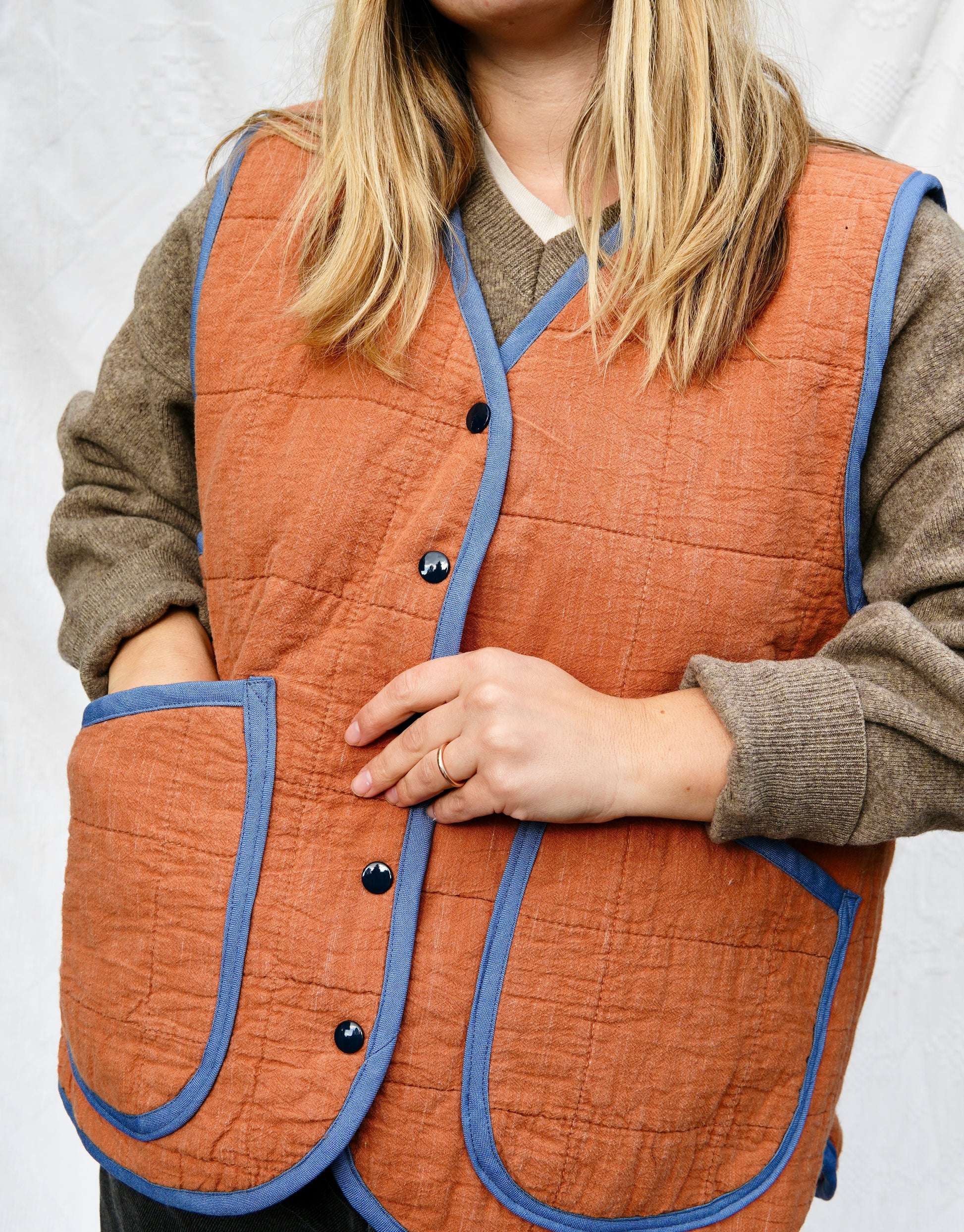 Made from a repurposed quilt with two front patch pockets and snap front closure. Quilt is medium weight and in excellent condition. Bound in a contrasting blue fabric.