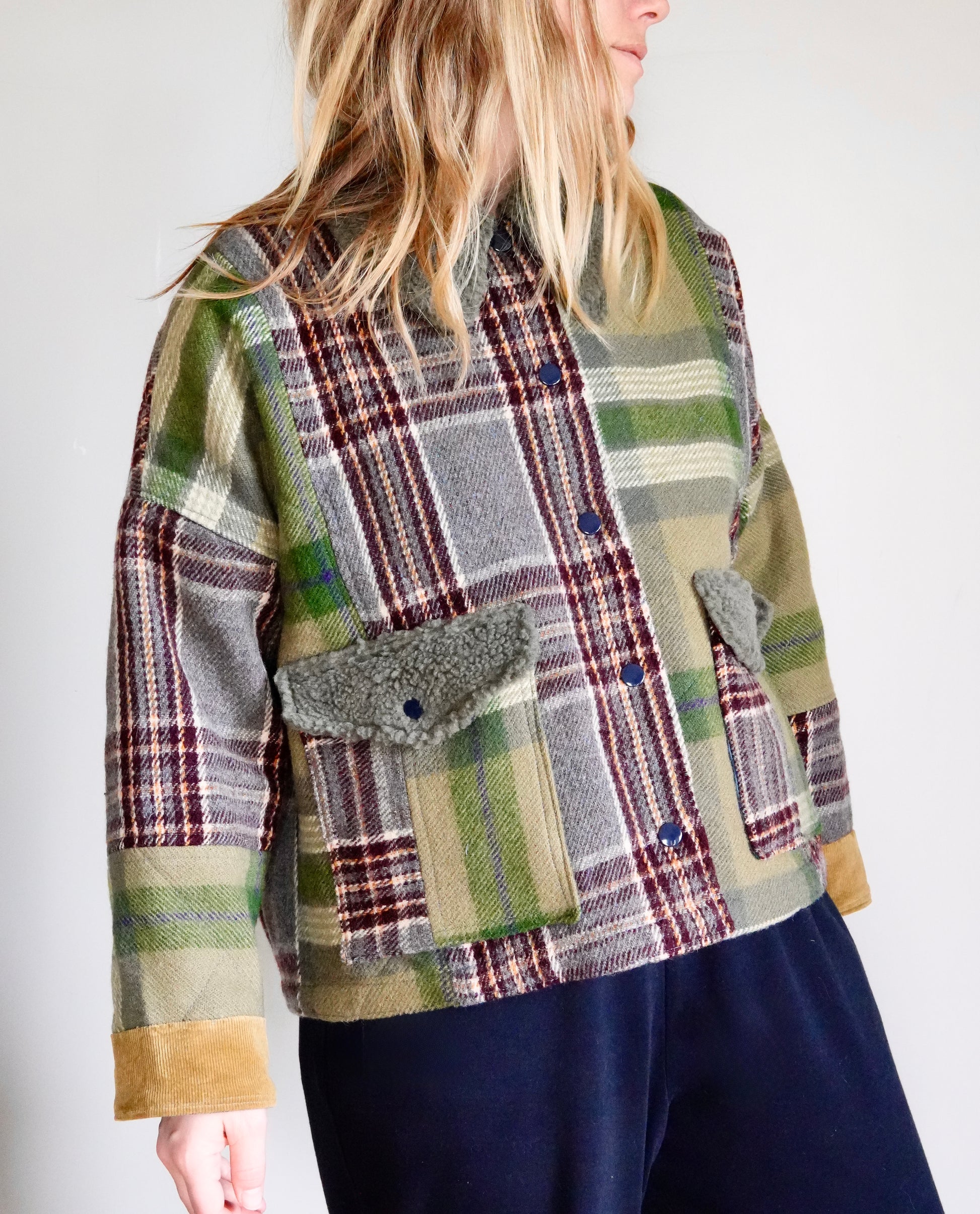One of a kind coat made form two plaid wool blankets. Fully lined with a fine suiting wool with corduroy on the cuffs.