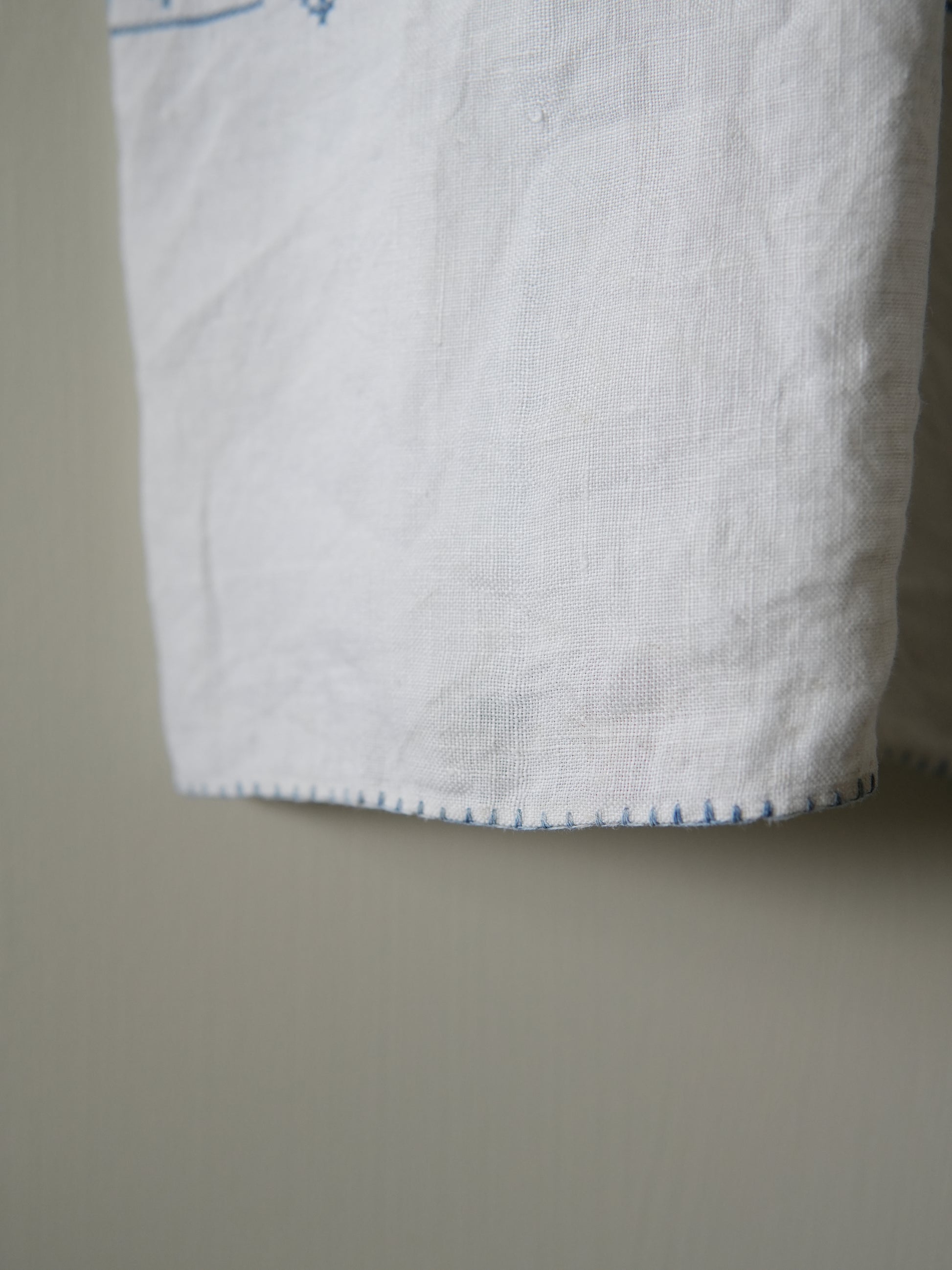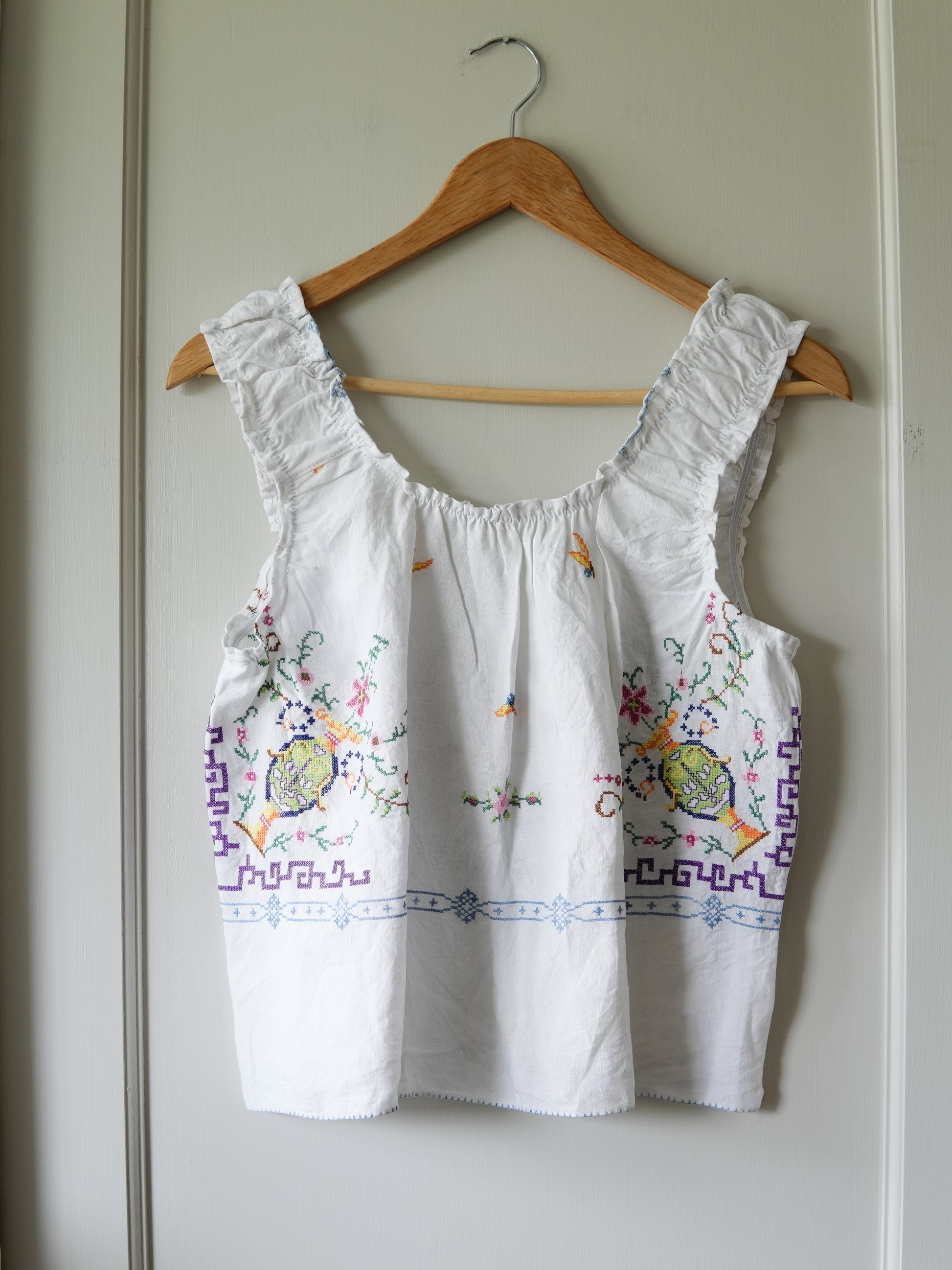 Tank with gathered elastic neckline and arm opening. Made from vintage linens with embroidered detailing. Inspired by vintage corset covers. All one of a kind.