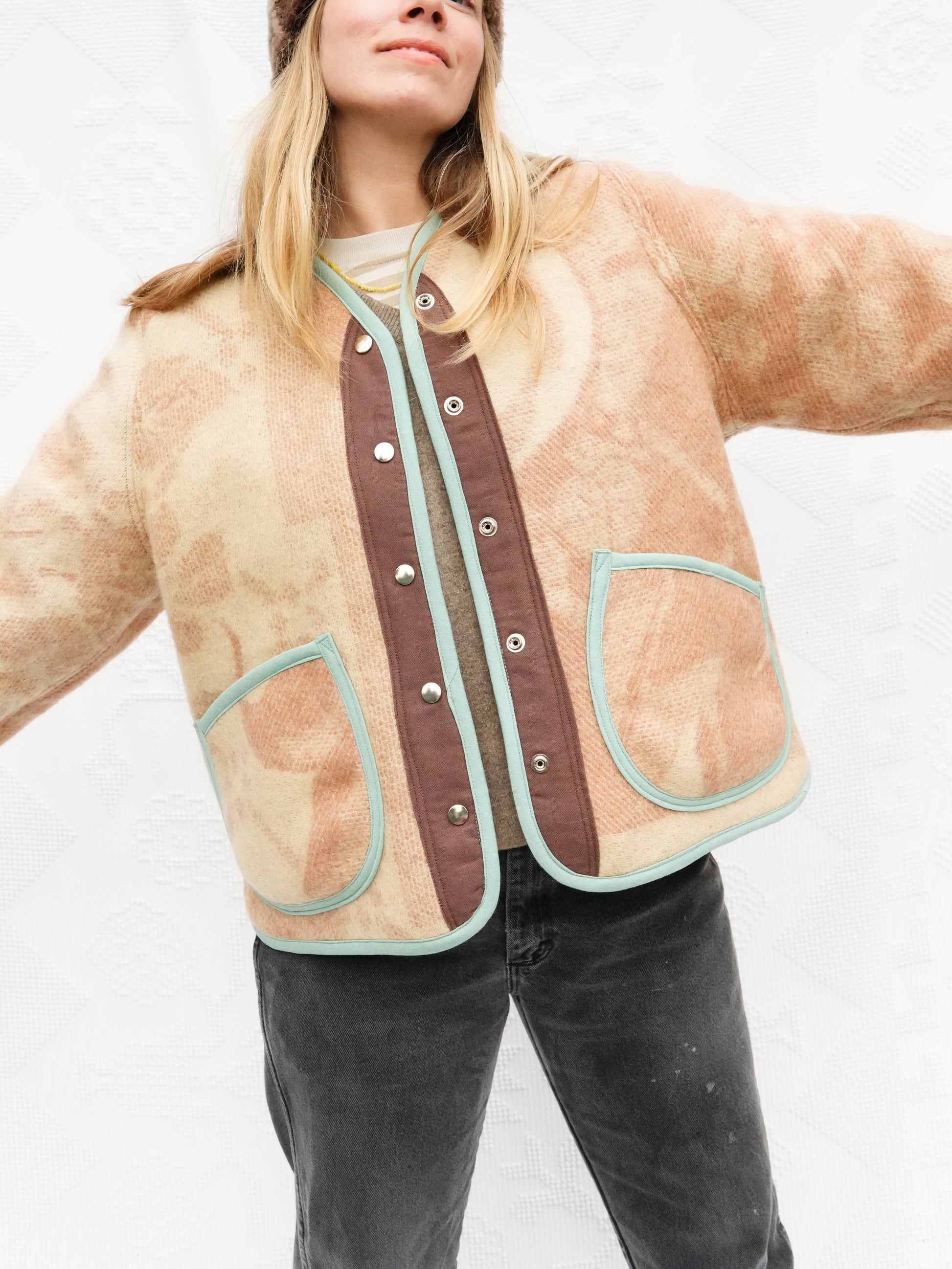 Made from a vintage wool blanket, this jacket is a true one of a kind beauty. Featuring a blue cotton binding with brown snap placket.